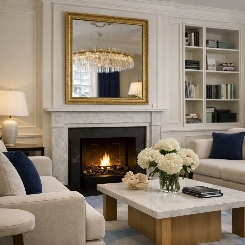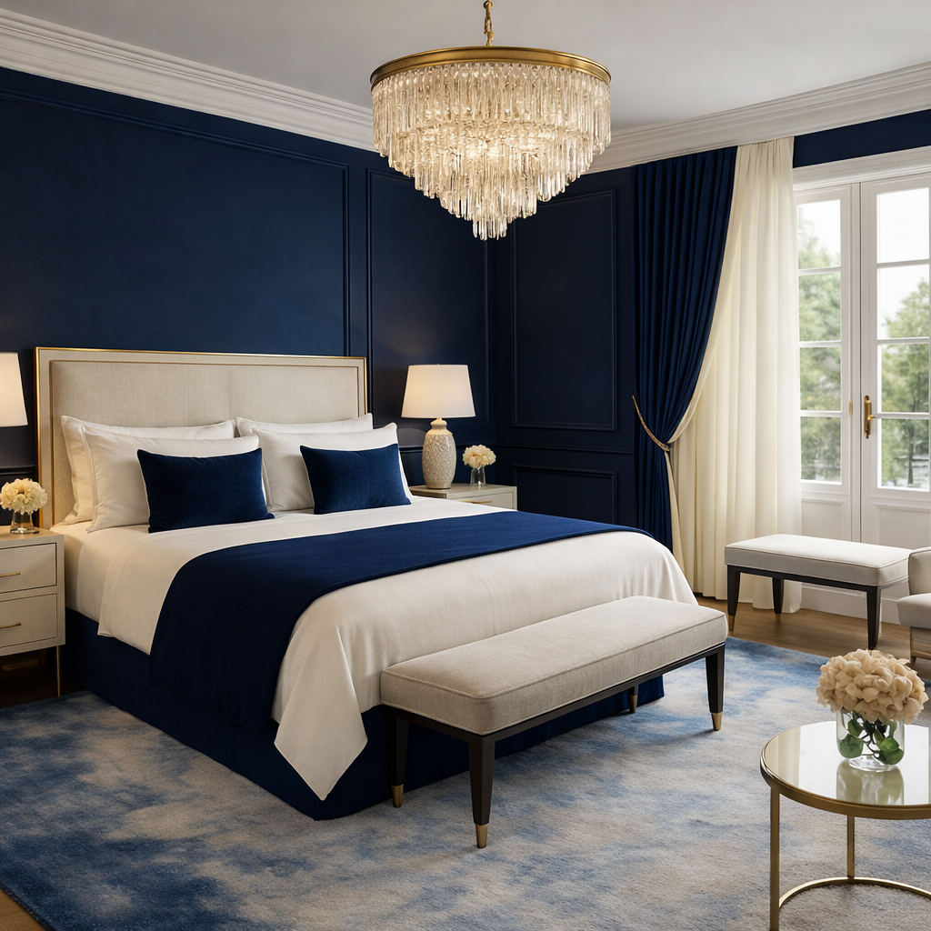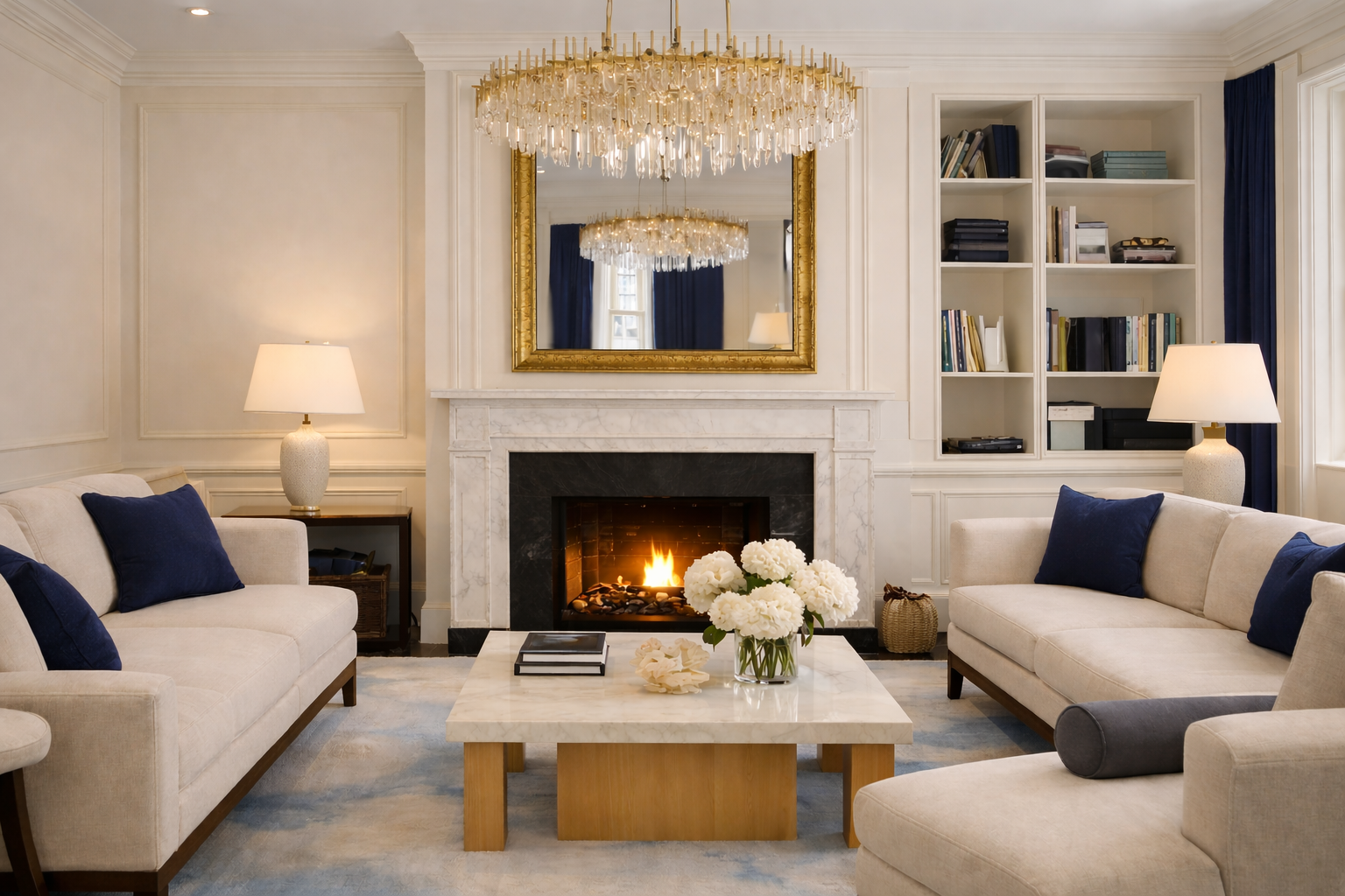 A classical interior reinterpreted through control and contrast. Structured proportions and decorative detailing are softened by a restrained palette, with deep blue accents introducing clarity and focus.