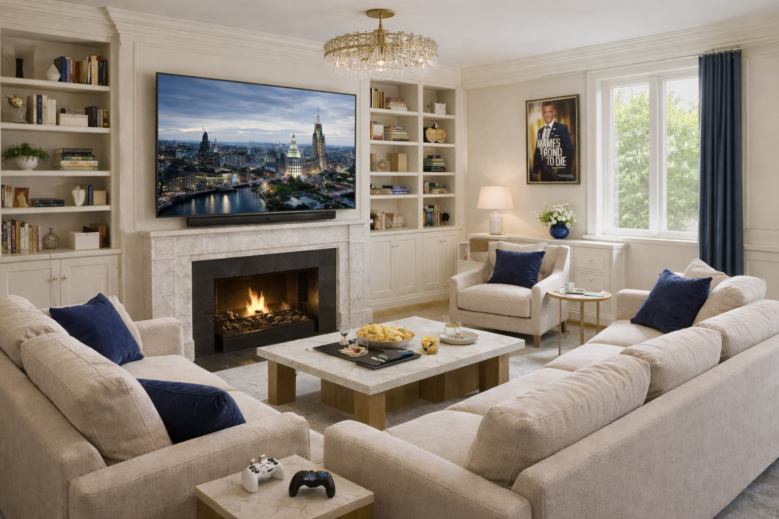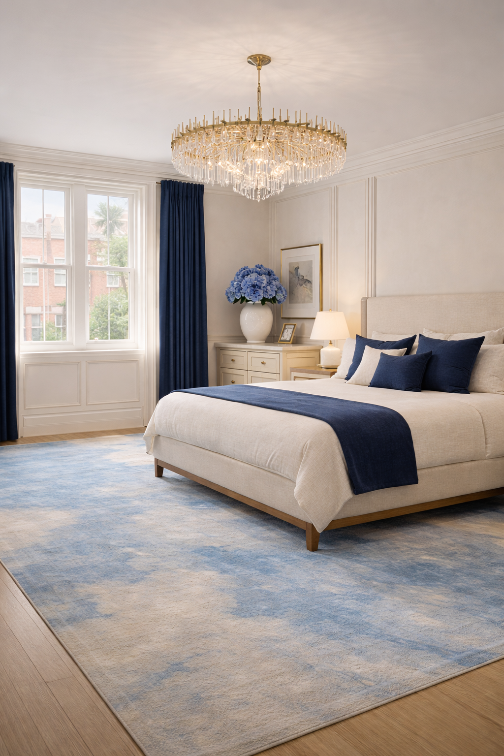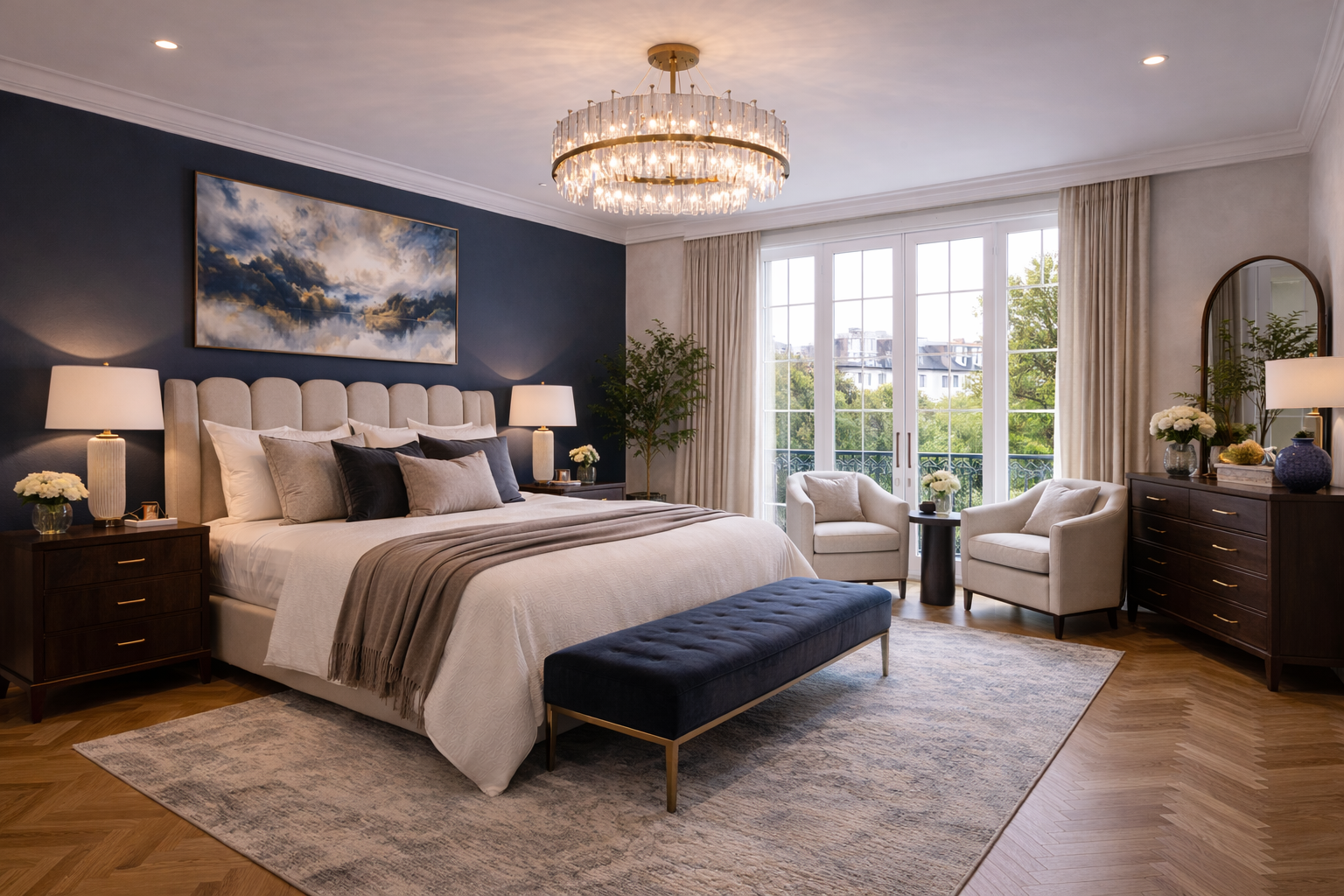 A classical interior reinterpreted through control and contrast. Structured proportions and decorative detailing are softened by a restrained palette, with deep blue accents introducing clarity and focus.